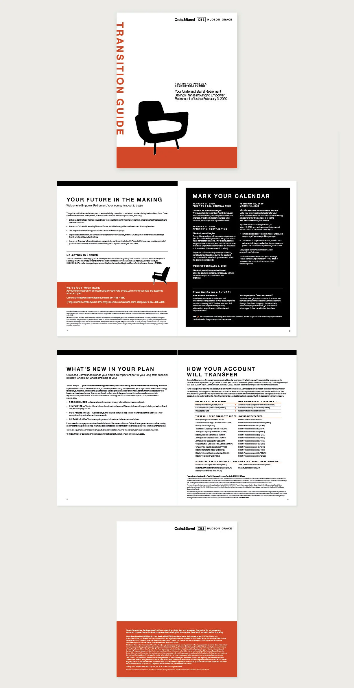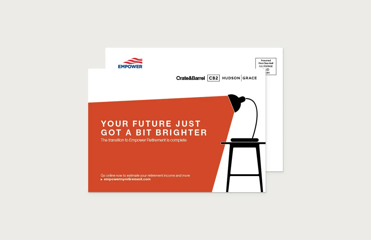After onboarding its 401(k) plan with Empower Retirement, Crate&Barrel requested custom retirement branding that could stand on its own while keeping a cohesive feel with their external consumer facing brand. The concept I created is built on the black and white palette that Crate&Barrel is known for while introducing fields of color, modern illustrations and icons to feel more personal.